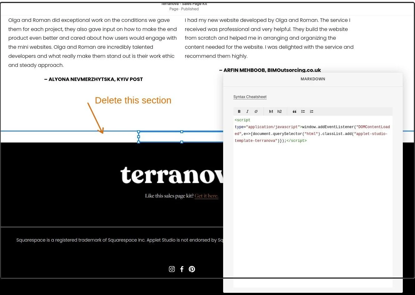 The section at the bottom of the page hosts a single markdown block with a short code snippet. All that does is adds a "applet-studio-template-terranova" class to the page, making it easier to target its elements via custom CSS without touching any other parts of your website.